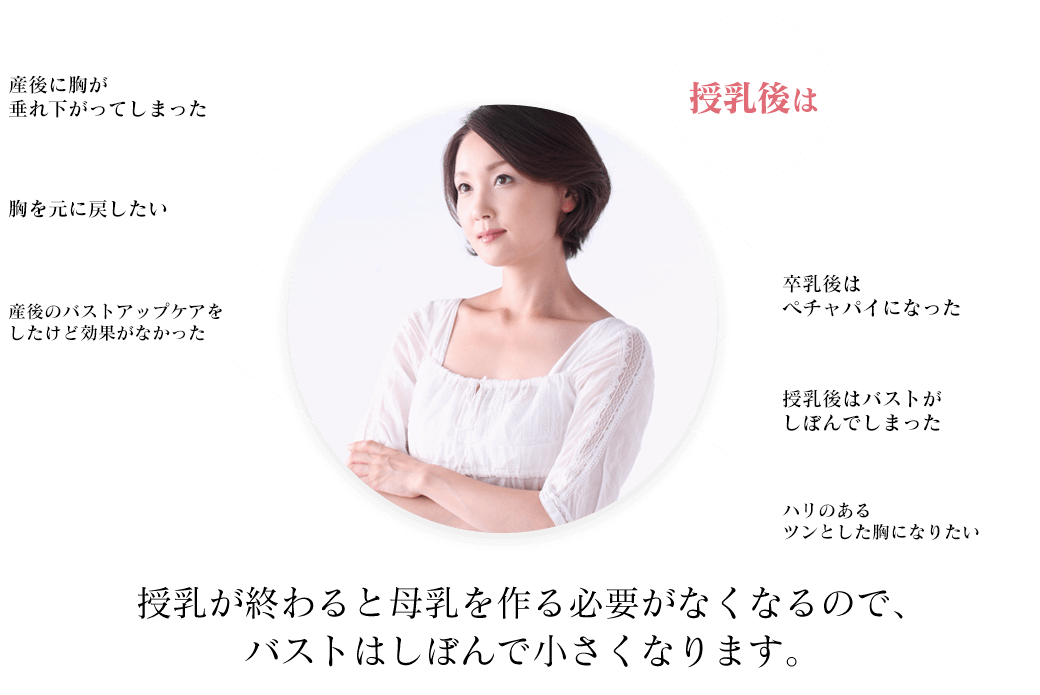 大きめのバストはしずく型の袋状になったり、小さめのバストは妊娠前より小さく縮んでしまう場合もあります。また、左右のバランスが変わってしまう、デコルテのハリがなくなった、バストトップ(乳首)が垂れてしまうなど、授乳後の悩み多々あります。