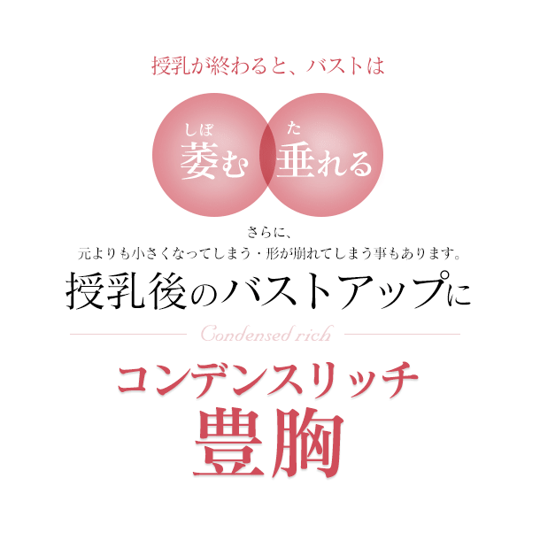 授乳後の皮膚が伸びてしまい垂れた状態のバストは、マッサージやエクササイズ、美容クリームでは元には戻りません。コンデンスリッチ豊胸では、自分の脂肪を注入するので、自然な触感と形で再びハリが戻ります。また、もともとバストが小さかった方は、授乳でバストが大きくなり皮膚が伸びるのでその分のボリュームアップが可能です。